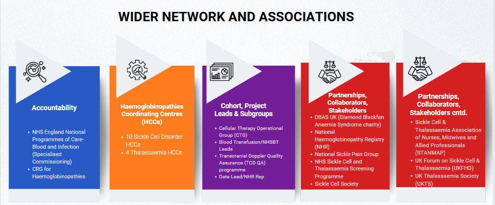 The strength of the NHP is the strong network which binds the members within, including the HCCs, as well as the strategic bonds it holds with other stakeholders within the haemoglobinopathies community, such as patient representation groups (Sickle Cell Society & UK Thalassaemia Society), Nursing Groups (STANMAP-Sickle Cell & Thalassaemia Association of Nurses, Midwives and Allied Professionals) and close engagement with organisations such as the UK Forum on Haemoglobin Disorders (UKFHD) and the Sickle Cell and Thalassaemia All-Party Parliamentary Group (SCT APPG). These are to name a few.